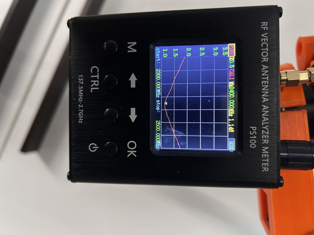 Um das SWR auf die Arbeitsfrequenz von 2,4 GHz (QO-100 Uplink) abzustimmen, ist zwingend ein NANO-VNA notwendig, der diesen Frequenzbereich noch abdeckt. Ich verwende dazu den VNA PS100 mit einem nutzbaren Frequenzbereich von 137,5 bis 2.700 MHz. Dieser wird mit einer Kombination aus N-Adapter und SMA-Adapter direkt an die Helix angeschlossen. Für den Abstimmvorgang sollte der Bullseye-LNB montiert sein.