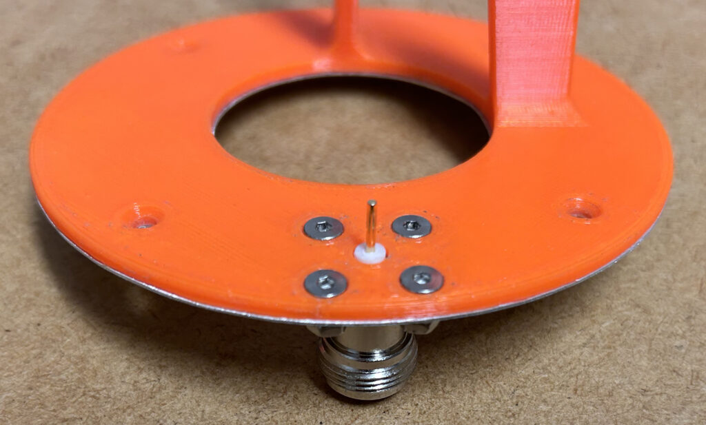 Die N-Buchse wird an der entsprechenden Position von unten an den Helix-Träger mit vier M3-Senkkopfschrauben samt M3-Mutter angeschraubt, um mit der Alufolie eine leitende Verbindung herzustellen.