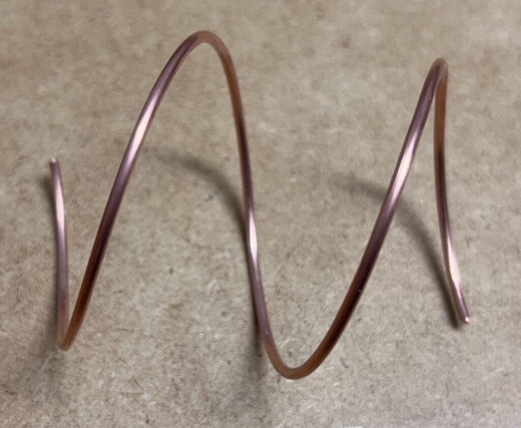 Mit der fertig gedruckten Formhilfe, wird ein Kupferdraht mit 2 mm Durchmesser geformt. Die Formhilfe ist am Anfangsbereich der Helix mit einer Fixierhilfe ausgestattet. Der Kupferdraht wird hier einfach bis zum Anfang der Führungsnut eingesteckt. Jetzt wird der Kupferdraht entlang der Führungsnut um die Formhilfe gebogen. Am oberen Ende der Führungsnut befindet sich eine Markierung, die die genaue Länge von 2,2 Windungen anzeigt. Hier wird der Kupferdraht mit einem Filzmarker markiert. Mit einer Zugabe von ca. 10 mm wird die Wendel ab gelängt.