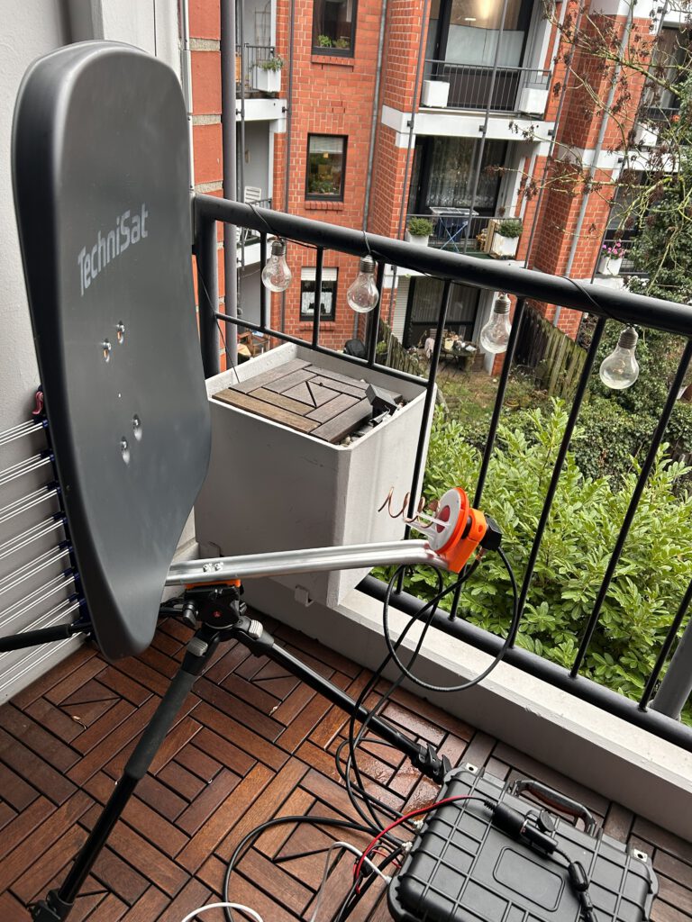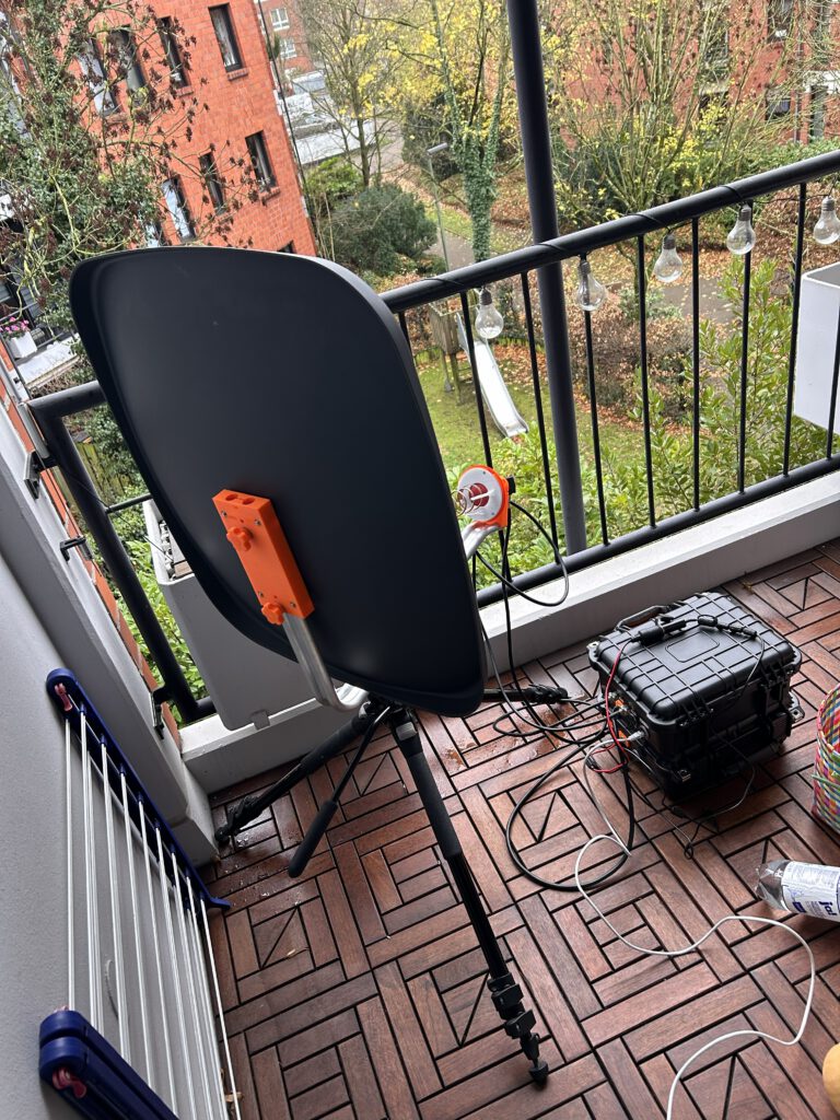 Als Ergänzung für den portablen Einsatz wurde noch ein Adapter entwickelt, mit dem die Satman 65 problemlos an einen Videoneigekopf von Manfrotto montiert werden kann. Die Ausrichtung auf QO-100 ist damit recht komfortabel möglich.